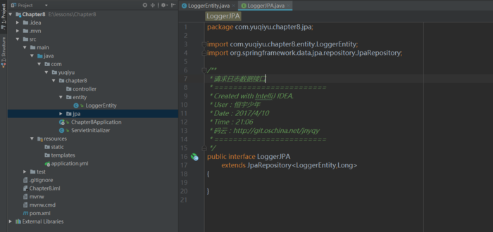 可以看到上图4,我们对应数据库内的表名以及字段名创建实体映射、字段映射,根据实体我们创建一个实现SpringDataJPA接口JpaRepository的子接口,LoggerJPA,如下图5所示: